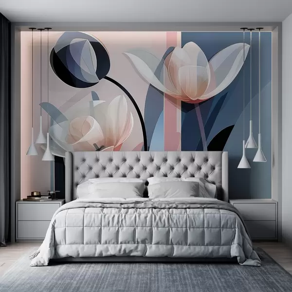 Fototapete Abstraktes modernes Design mit Tulpen mit transparenten Blütenblättern in Pastelltönen von Rosa, Weiß und Dunkelblau w09116