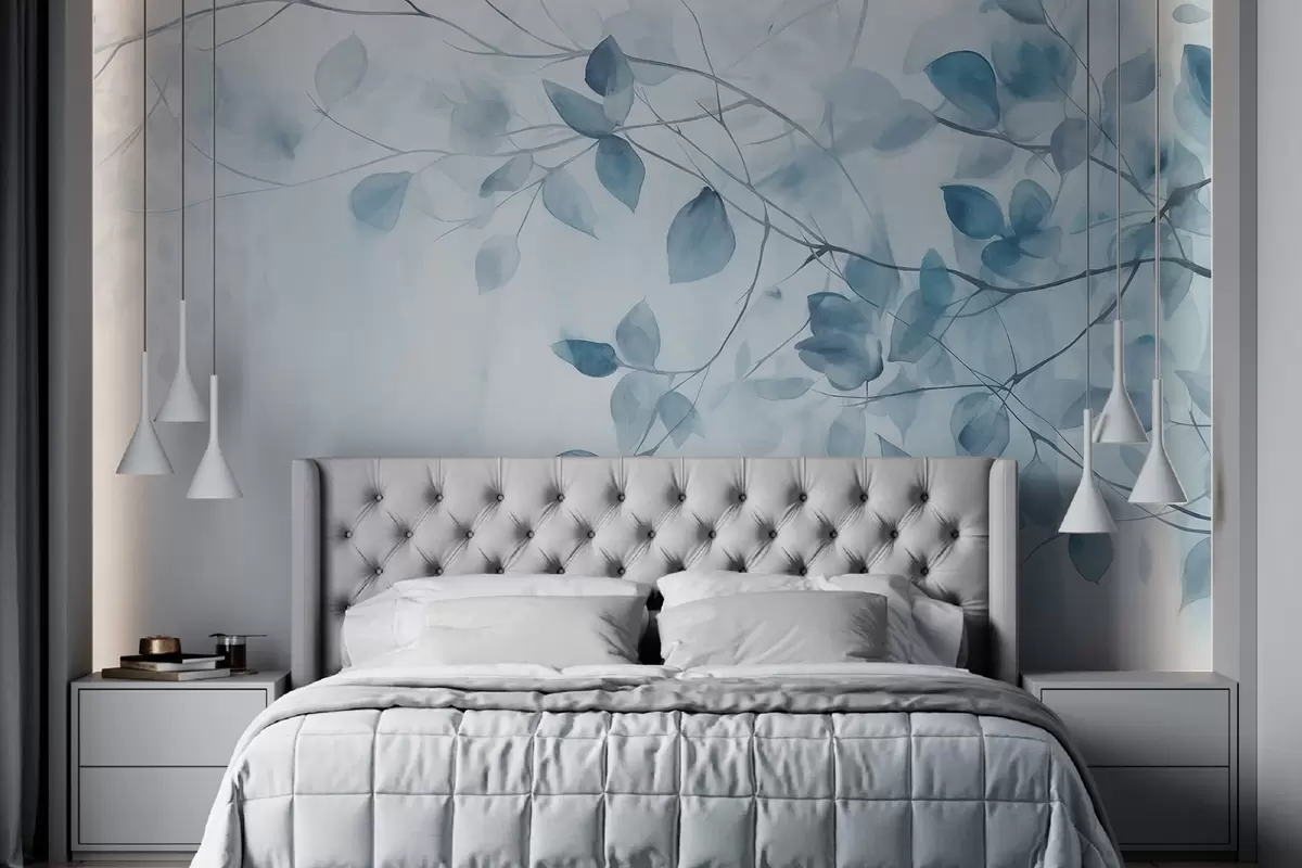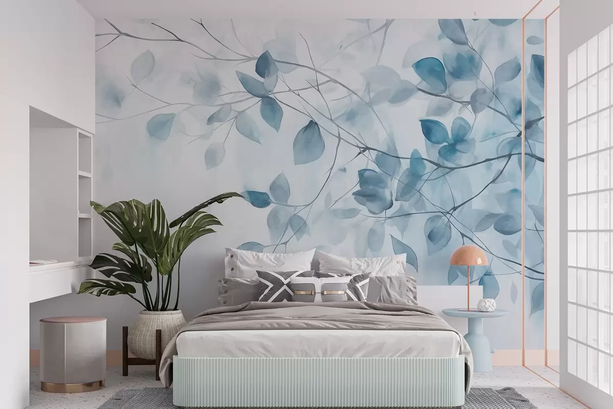 Fototapeten Texturale Aquarellmalerei Nachahmung von blauen Blättern und Zweigen, weiche Farben, zarte Details vor weißem Hintergrund N° w09133v1