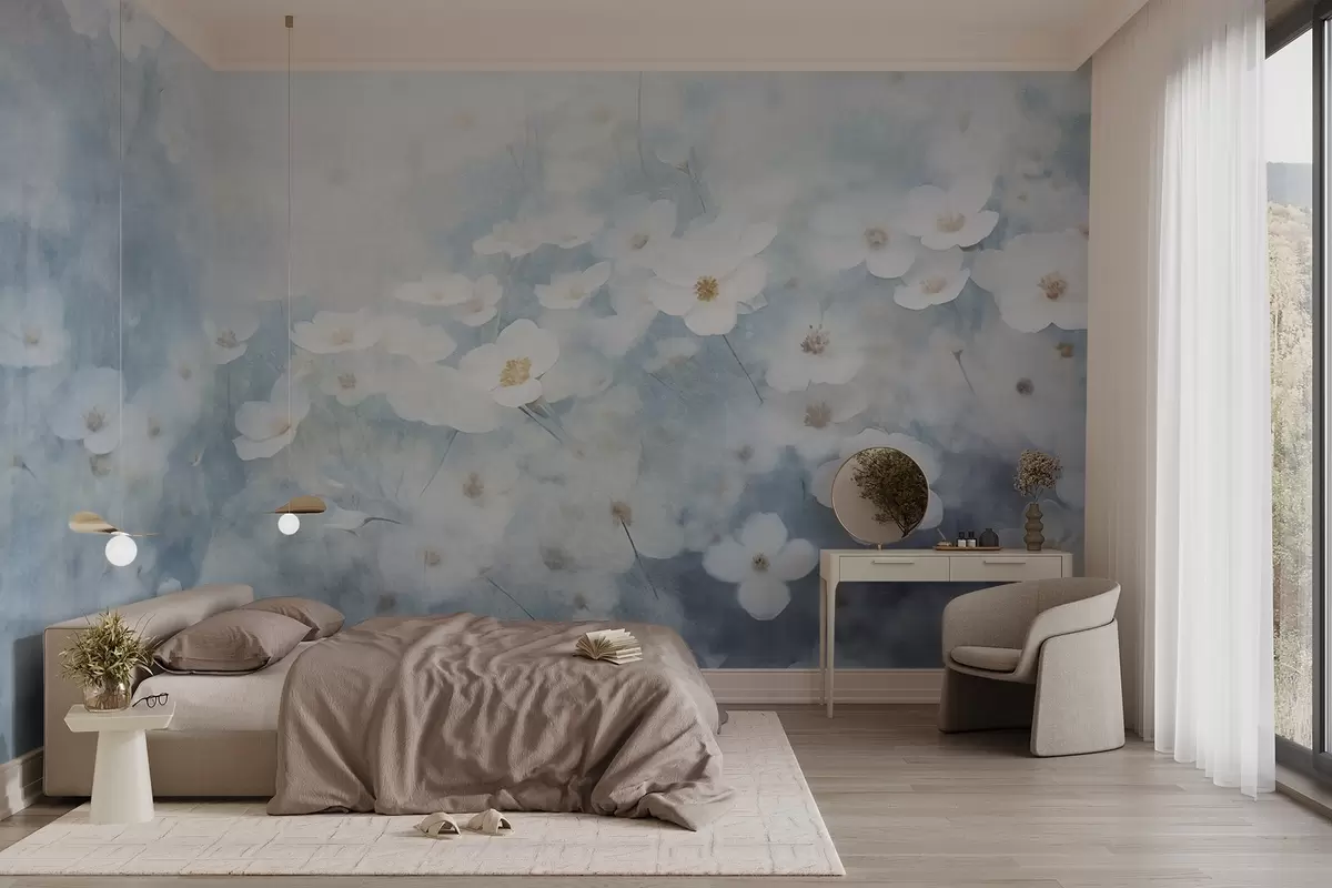 Fototapeten Strukturiertes Feld von weißen Anemonenblüten, Weichzeichner, verträumte Atmosphäre, hellblaue und weiße Farbpalette, Frühlingswiese N° w09134