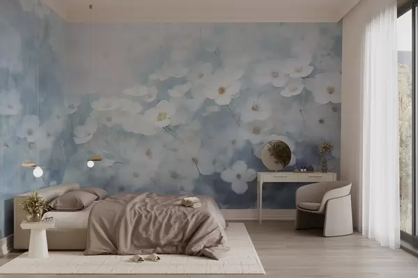 Fototapeten Strukturiertes Feld von weißen Anemonenblüten, Weichzeichner, verträumte Atmosphäre, hellblaue und weiße Farbpalette, Frühlingswiese N° w09134