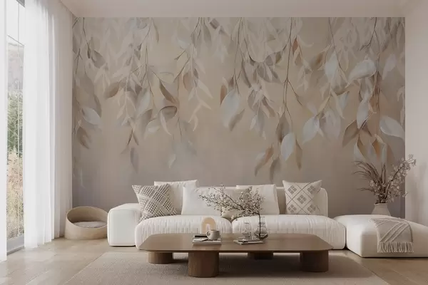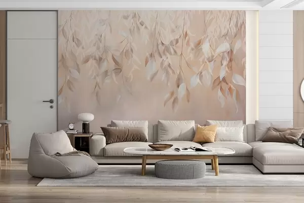 Fototapeten Hängende strukturierte weiße und beige Blätter mit einer weichen Farbpalette, Pfirsich, grau und weiß zarten Hintergrund N° w09136