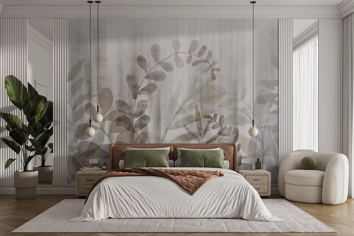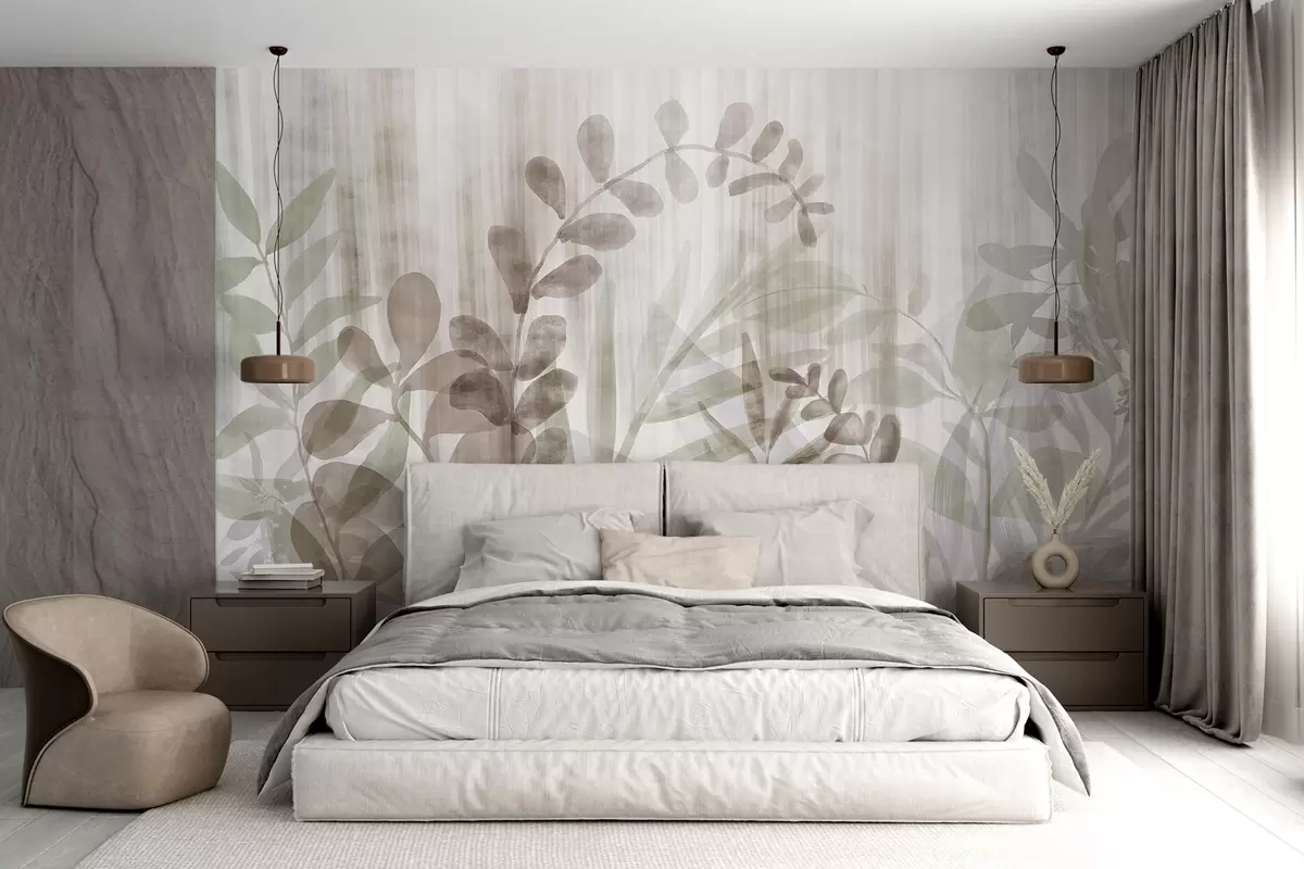 Fototapeten Aquarellmalerei Nachahmung von Pflanzen mit mehrfarbigen gedämpften Blättern, heller Hintergrund mit vertikalen Linien, botanische Illustration N° w09146v1