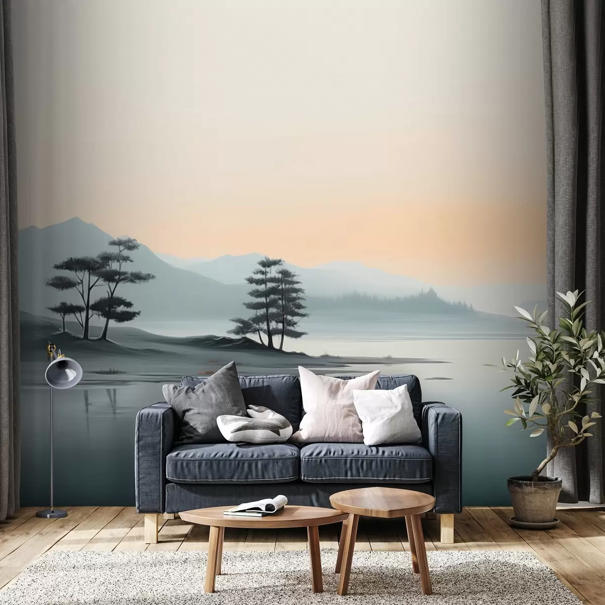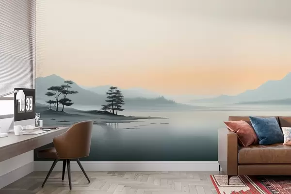 Fototapeten Minimalistische Landschaft mit nebligen Bergen und einem See N° w09151