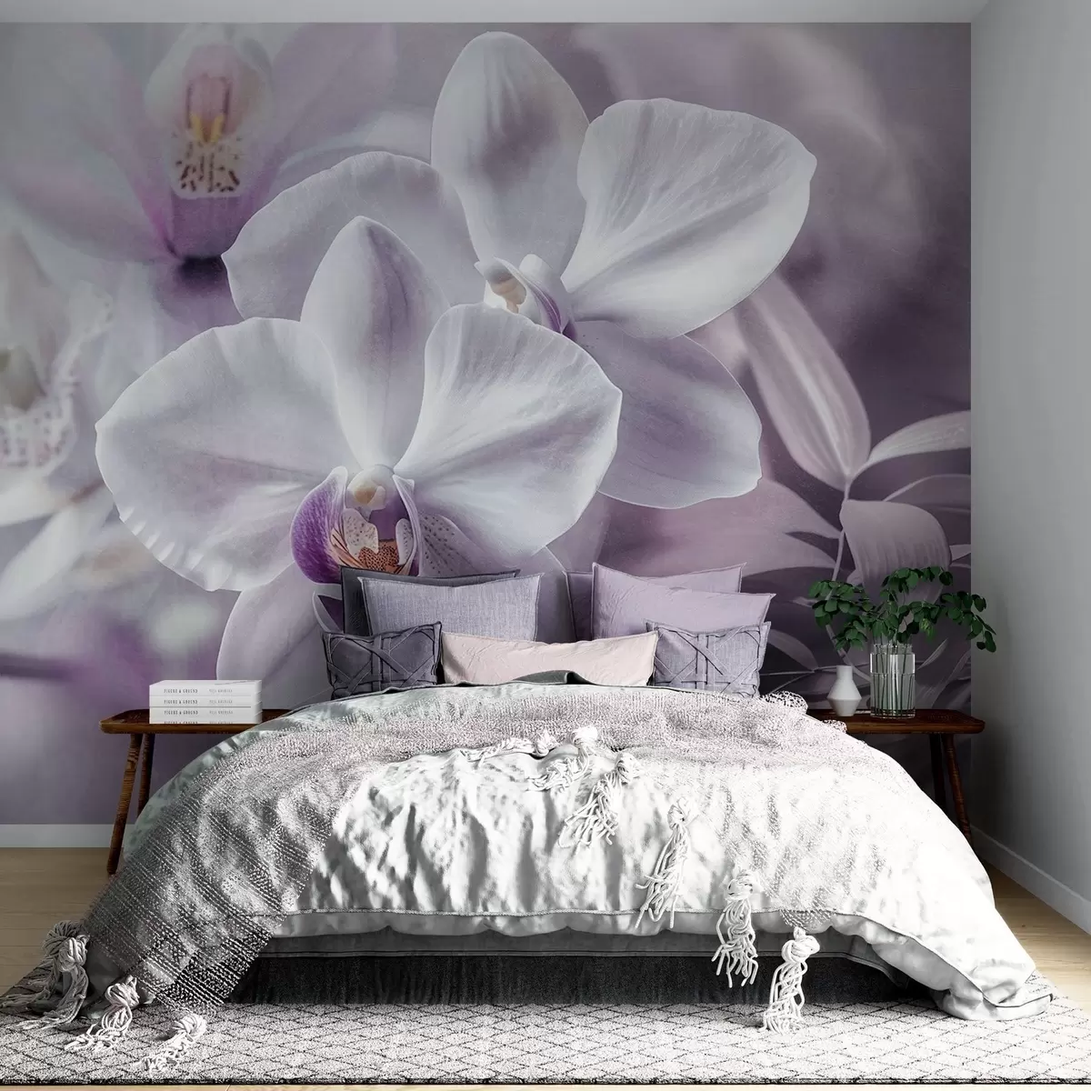Fototapeten Weiße und lilafarbene zarte Orchideenblüten, weiche Beleuchtung und ein verschwommener, strukturierter Hintergrund N° w09155