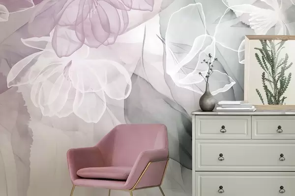 Fototapeten Blüten und Blätter mit transparenten Blütenblättern in Weiß-, Rosa- und Grüntönen, weich und zart N° w09158v1