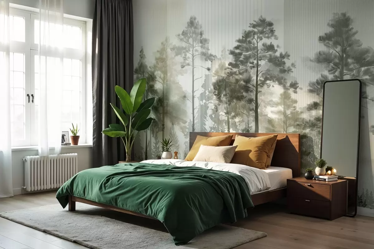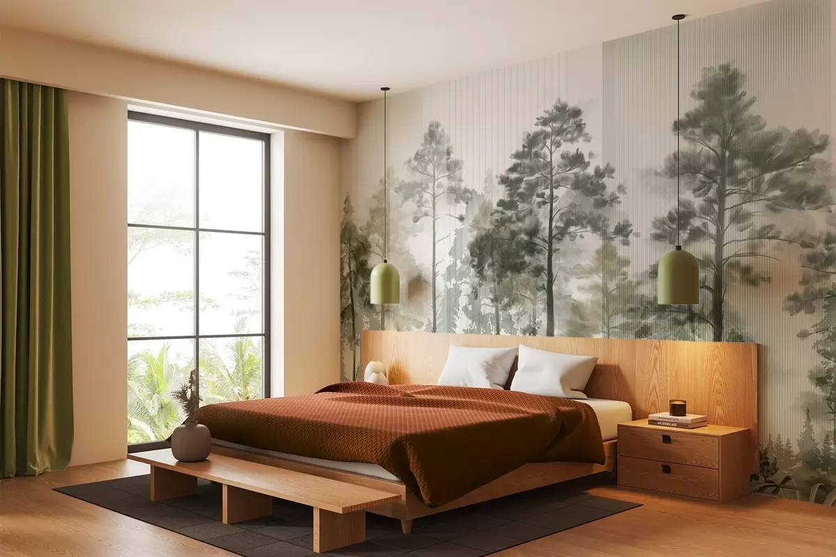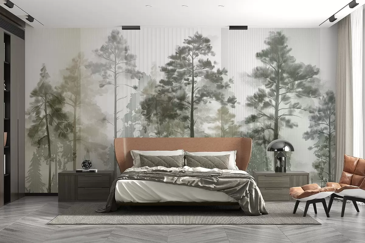 Fototapeten Ein dichter Wald mit hohen Kiefern, üppigem grünen Laub, einer nebligen Atmosphäre mit vertikalen Linien Texturen N° w09163