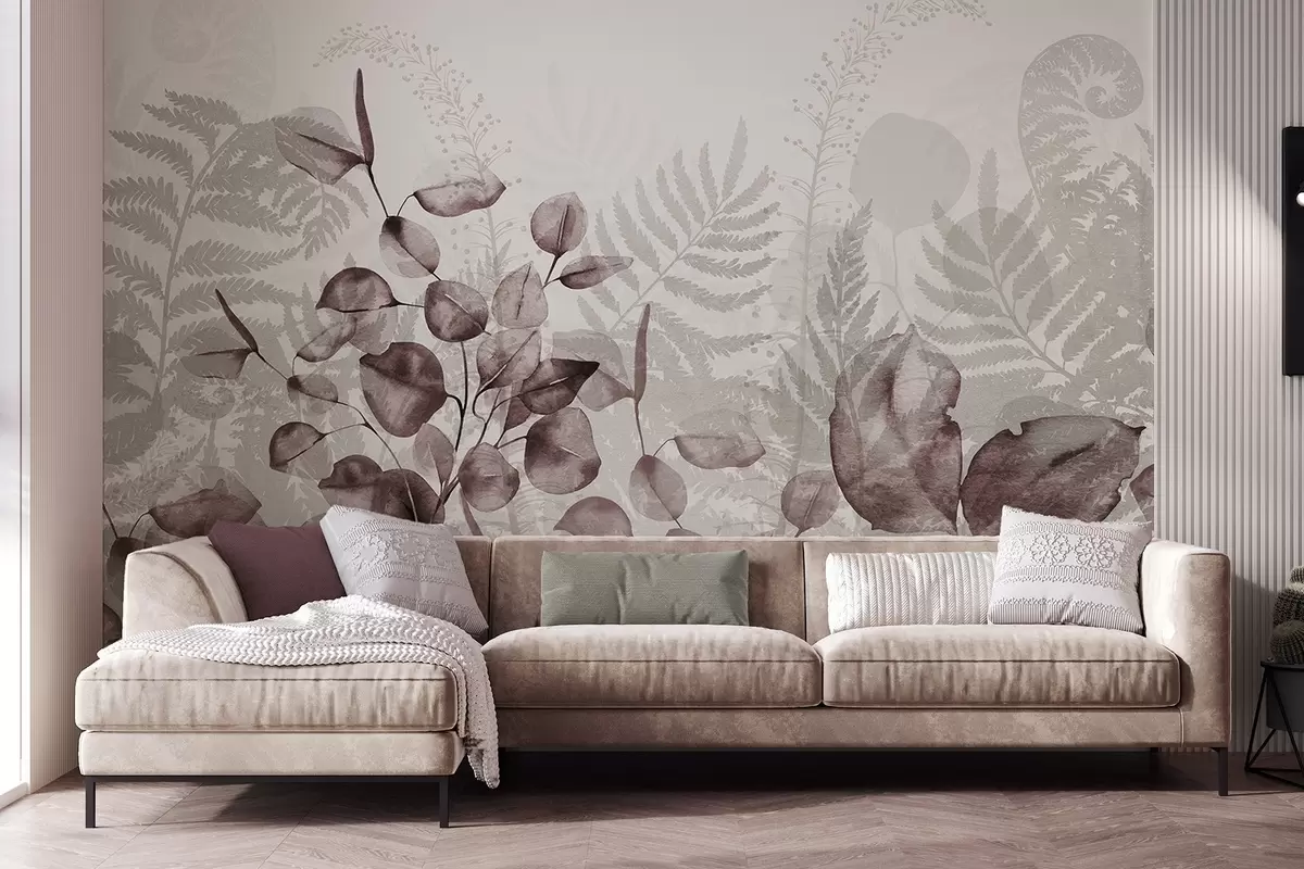 Fototapeten Eukalyptus- und Farnblätter in Bordeaux- und Grautönen, Aquarelleffekt, botanische Illustration N° w09197v1