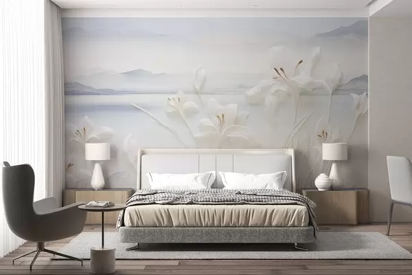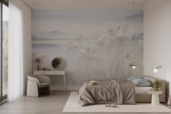 Fototapeten Weiße Lilien mit langen Stielen und Blättern, Berge und See im Hintergrund, minimalistische Landschaftskomposition N° w09206