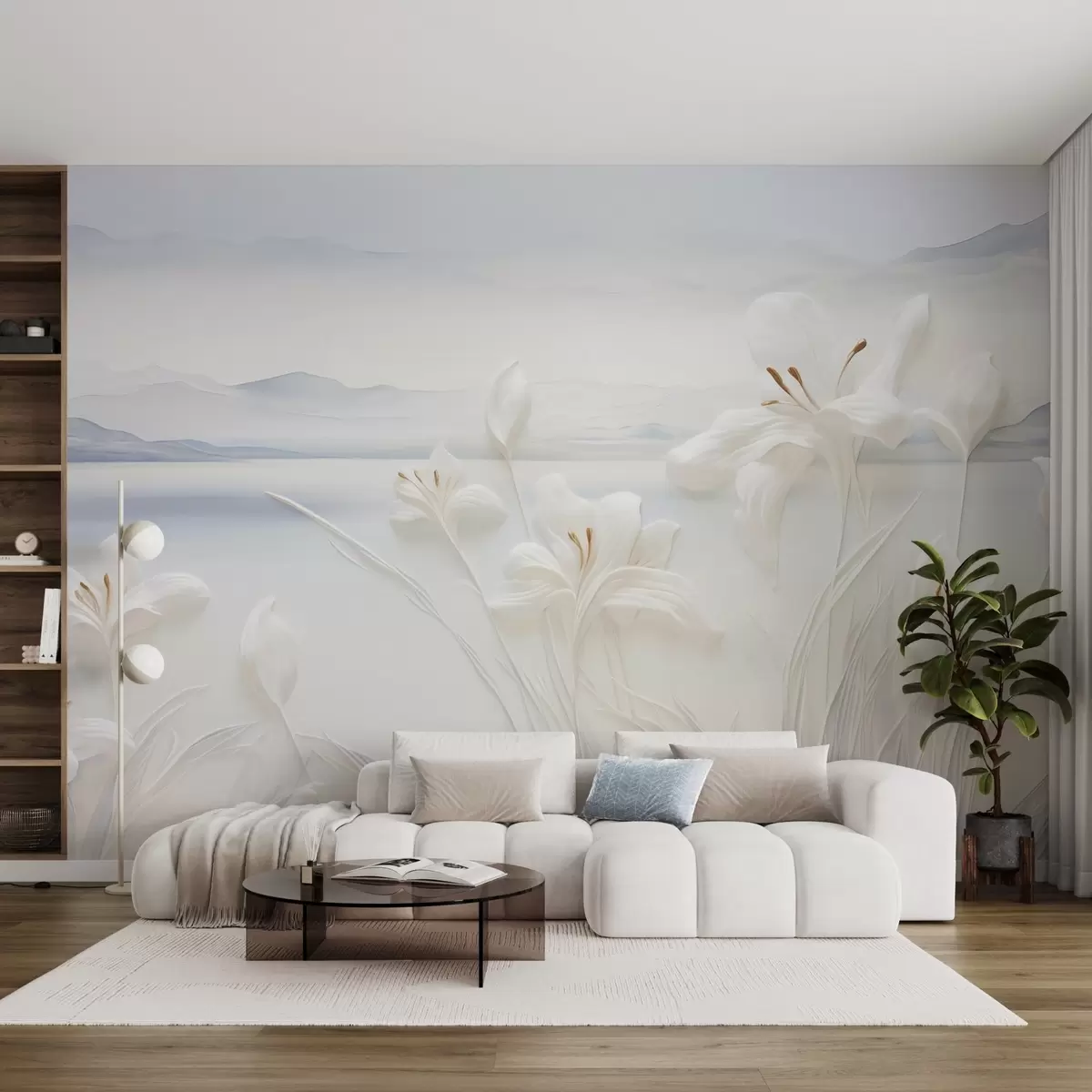 Fototapeten Weiße Lilien mit langen Stielen und Blättern, Berge und See im Hintergrund, minimalistische Landschaftskomposition N° w09206