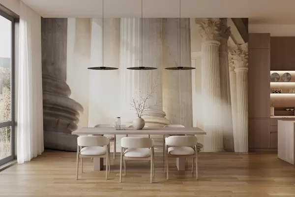 Fototapeten Säulen, klassische Architektur, elegantes Design, strukturierte symmetrische Komposition, neutrale Farbpalette N° w09209