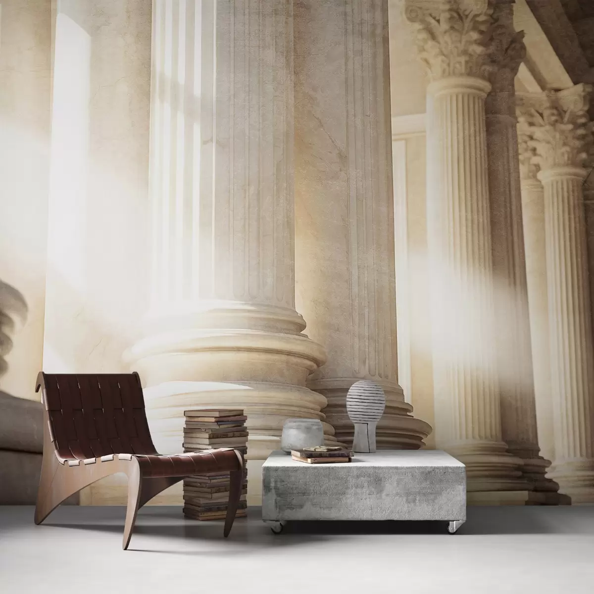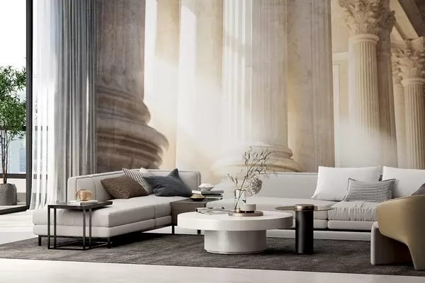 Fototapeten Säulen, klassische Architektur, elegantes Design, strukturierte symmetrische Komposition, neutrale Farbpalette N° w09209