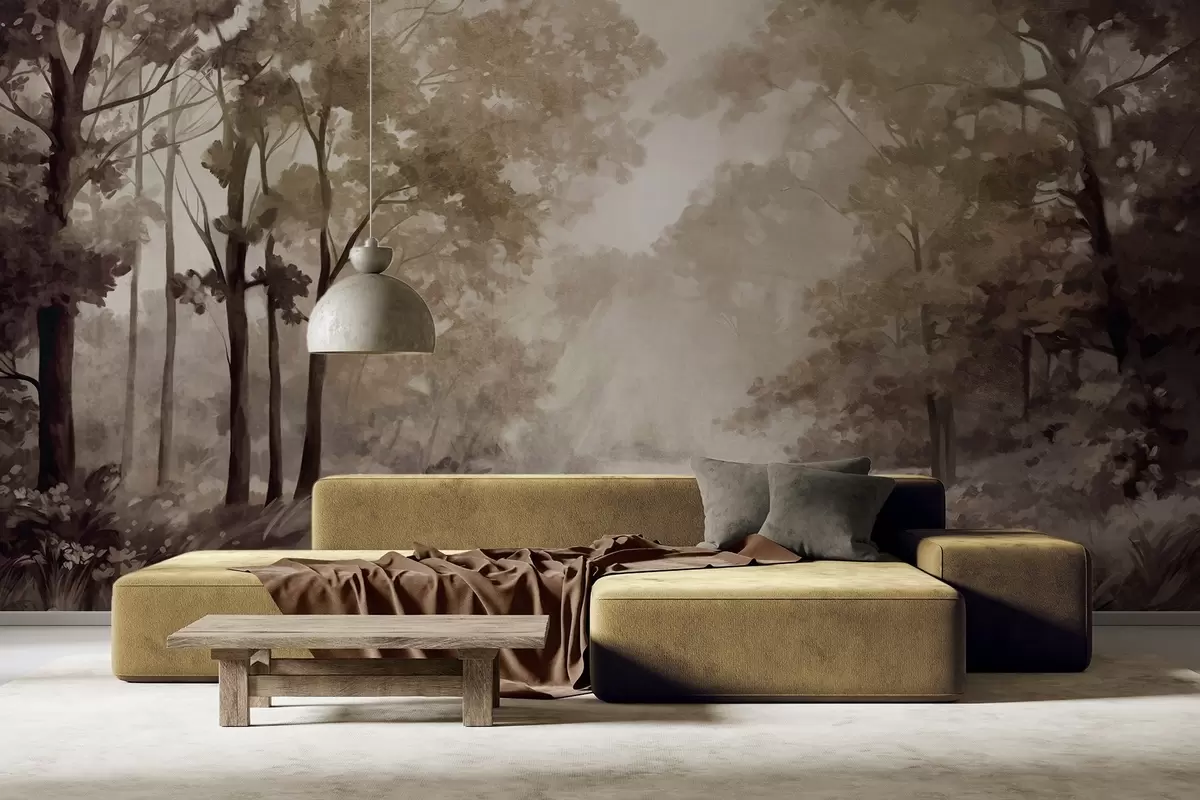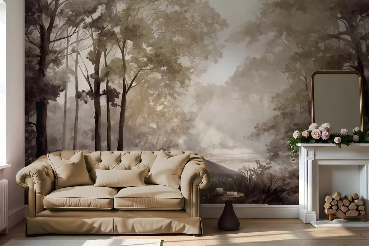 Fototapeten Texturierte Waldlandschaft, Bäume mit beigen und braunen Blättern, pastellfarbene Palette N° w09210