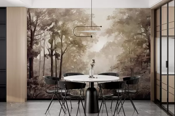 Fototapeten Texturierte Waldlandschaft, Bäume mit beigen und braunen Blättern, pastellfarbene Palette N° w09210
