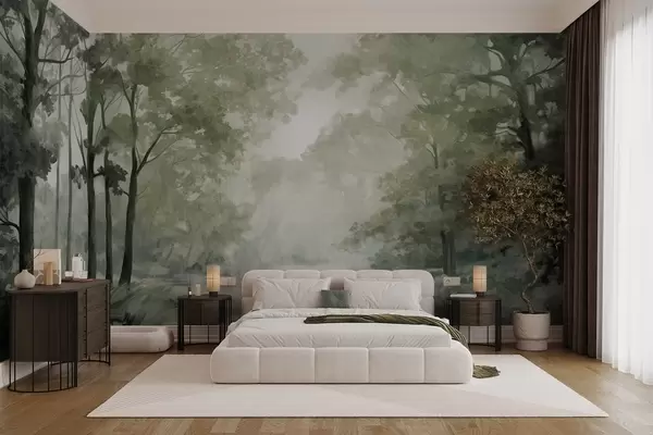 Fototapeten Texturierte Waldlandschaft, Bäume mit grünen Blättern, pastellfarbene Palette N° w09210v2