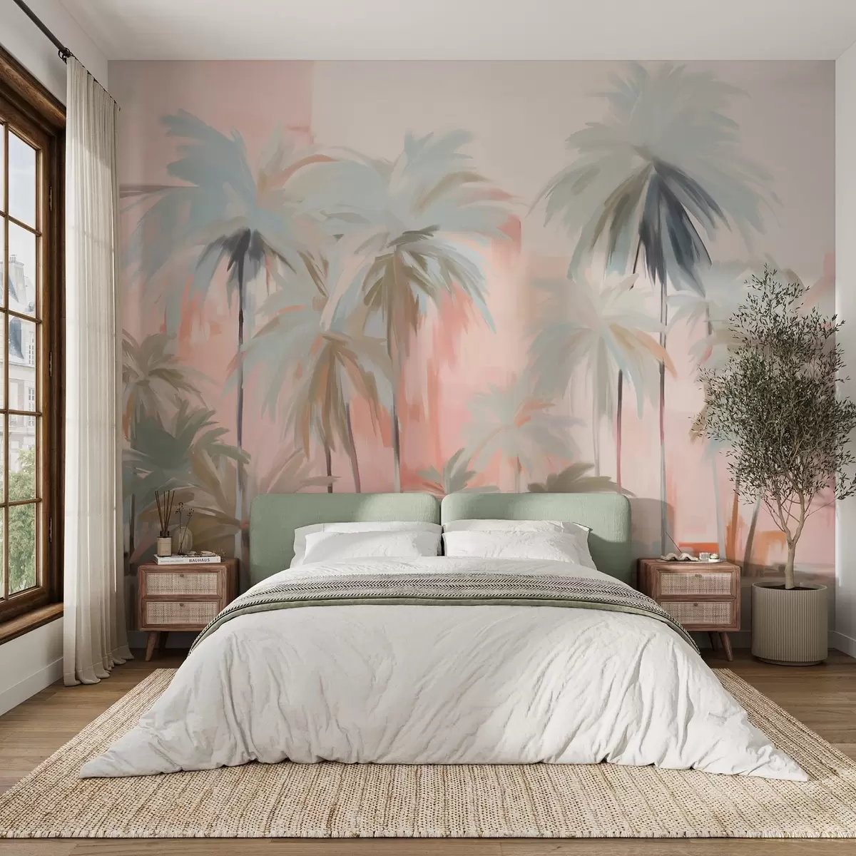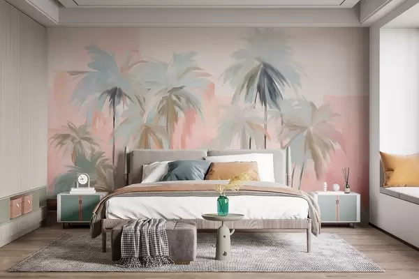Fototapeten Abstrakte, minimalistische, pastellfarbene tropische Palmen vor einem Hintergrund aus sanften Rosa- und Pfirsichtönen N° w09212