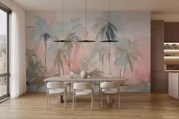 Fototapeten Abstrakte, minimalistische, pastellfarbene tropische Palmen vor einem Hintergrund aus sanften Rosa- und Pfirsichtönen N° w09212