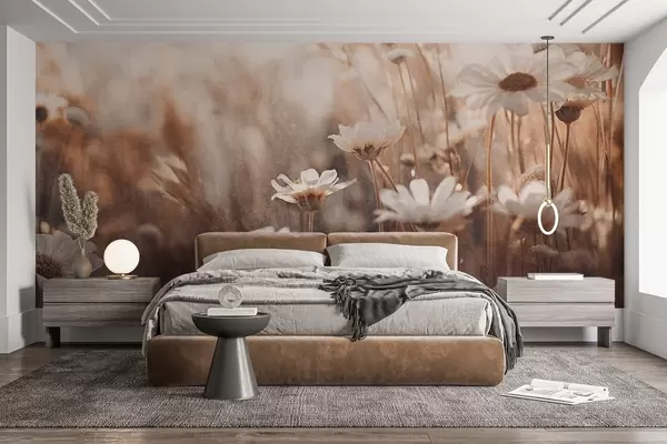 Fototapeten Strukturiertes Feld von weißen Gänseblümchen und Wildblumen in warmer Farbpalette mit verschwommenem Hintergrund N° w09214