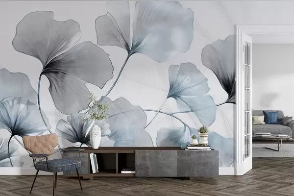 Fototapeten Ginkgo biloba Blätter in gedämpften Blau- und Grautönen, zart strukturierter Aquarelleffekt, heller Hintergrund N° w09215v1