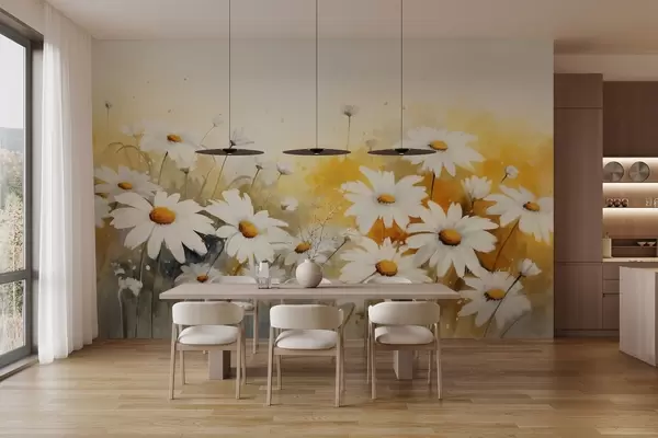 Fototapeten Ein Feld von weißen Gänseblümchen mit gelben Zentren, vor einem weichen gelben und beigen Hintergrund, Aquarell-Stil N° w09218