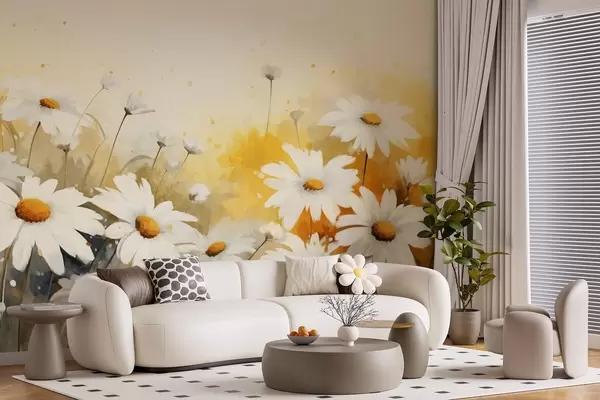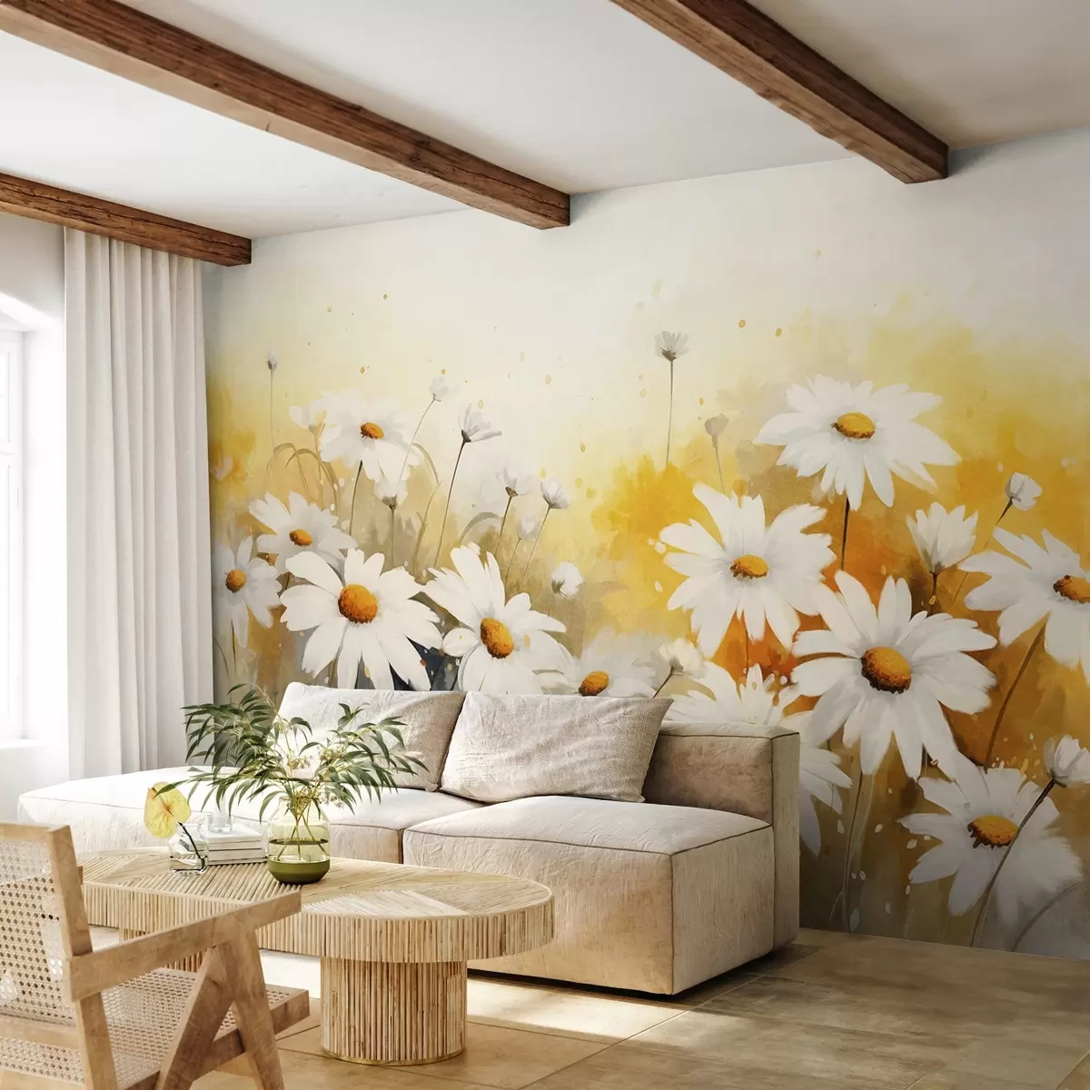 Fototapeten Ein Feld von weißen Gänseblümchen mit gelben Zentren, vor einem weichen gelben und beigen Hintergrund, Aquarell-Stil N° w09218