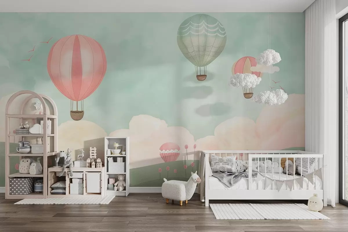 Fototapeten Heißluftballons über Hügeln mit Wolken N° w09228