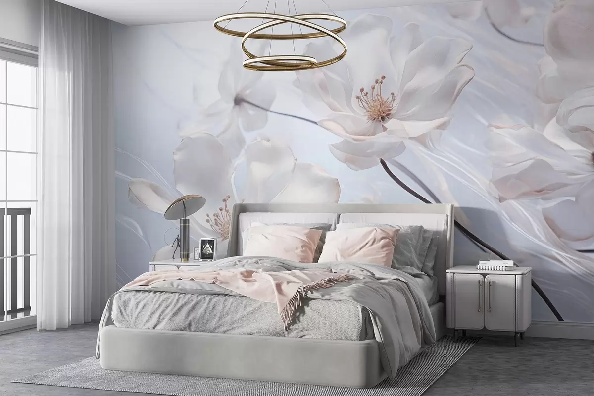 Fototapeten Weiße strukturierte transparente Blumen mit zarten Blütenblättern, weicher hellblauer Hintergrund, elegant, romantisch, verträumt N° w09233