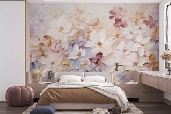 Fototapeten Ölgemälde Nachahmung eines Blumengartens mit weißen, rosa und orangefarbenen Blumen, weiche Pinselstriche, Pastell gedämpfte Farben N° w09236