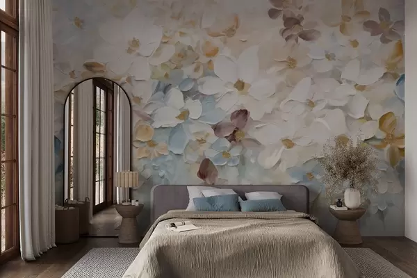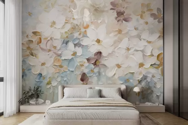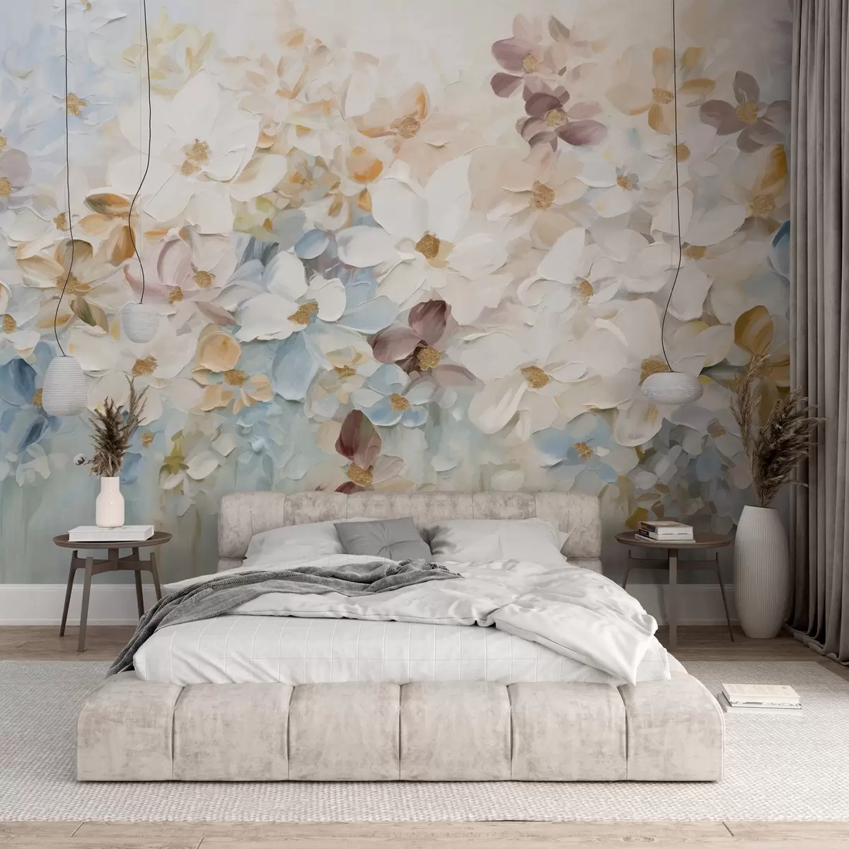 Fototapeten Ölgemälde Nachahmung eines Blumengartens mit weißen, blauen und orangefarbenen Blumen, weiche Pinselstriche, Pastell gedämpfte Farben N° w09236v1
