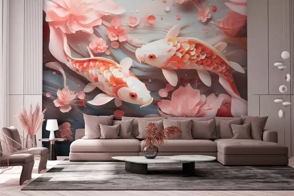 Fototapeten Zarte Fische mit dimensionalen Schuppen schwimmen durch einen Fluss von Blütenblättern und zarten Rosatönen N° w09237