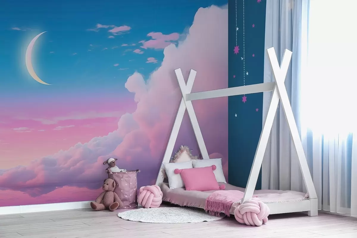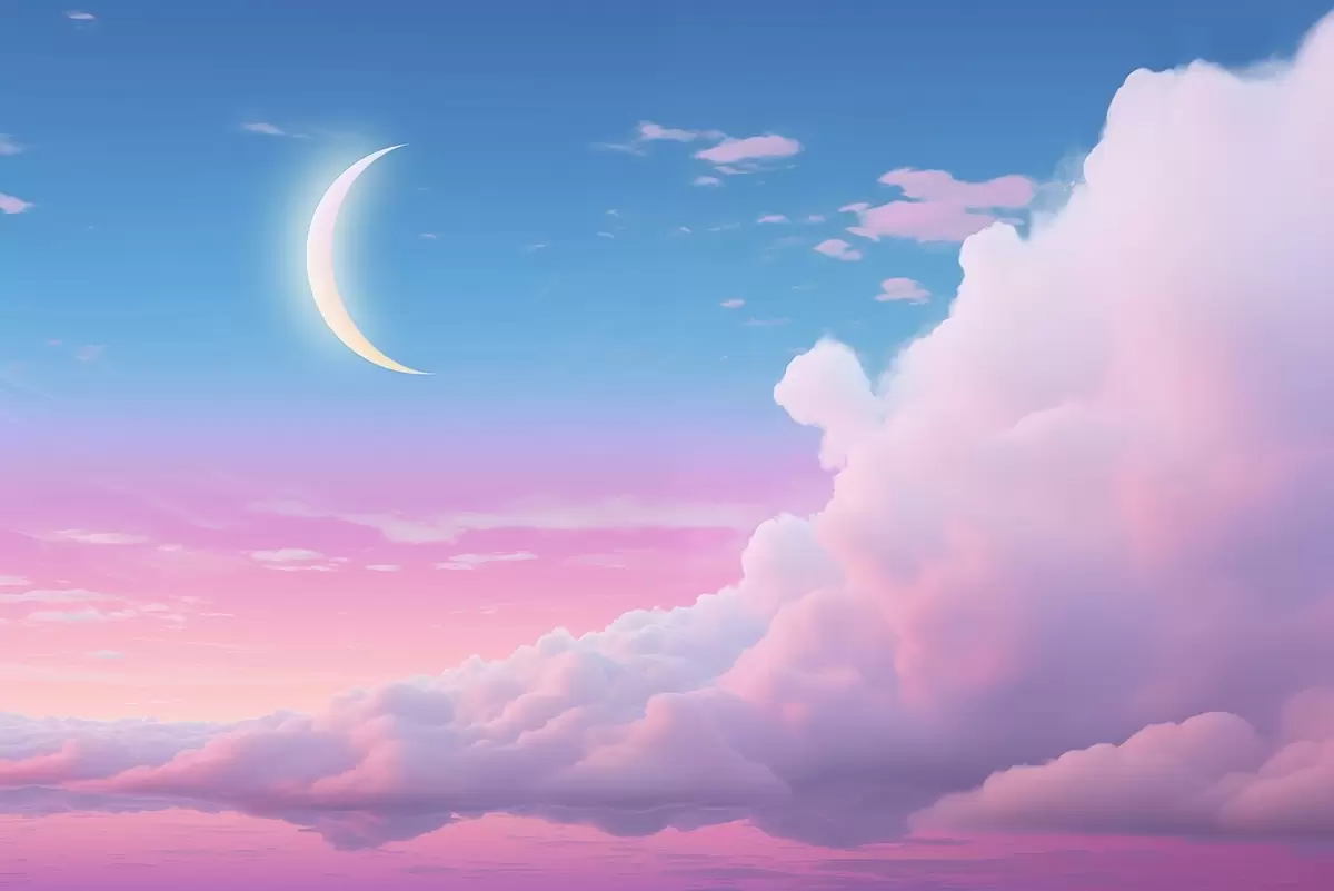 Fototapeten Magischer Sonnenuntergang mit Wolken und Mondsichel in Rosa- und Blautönen N° w09240