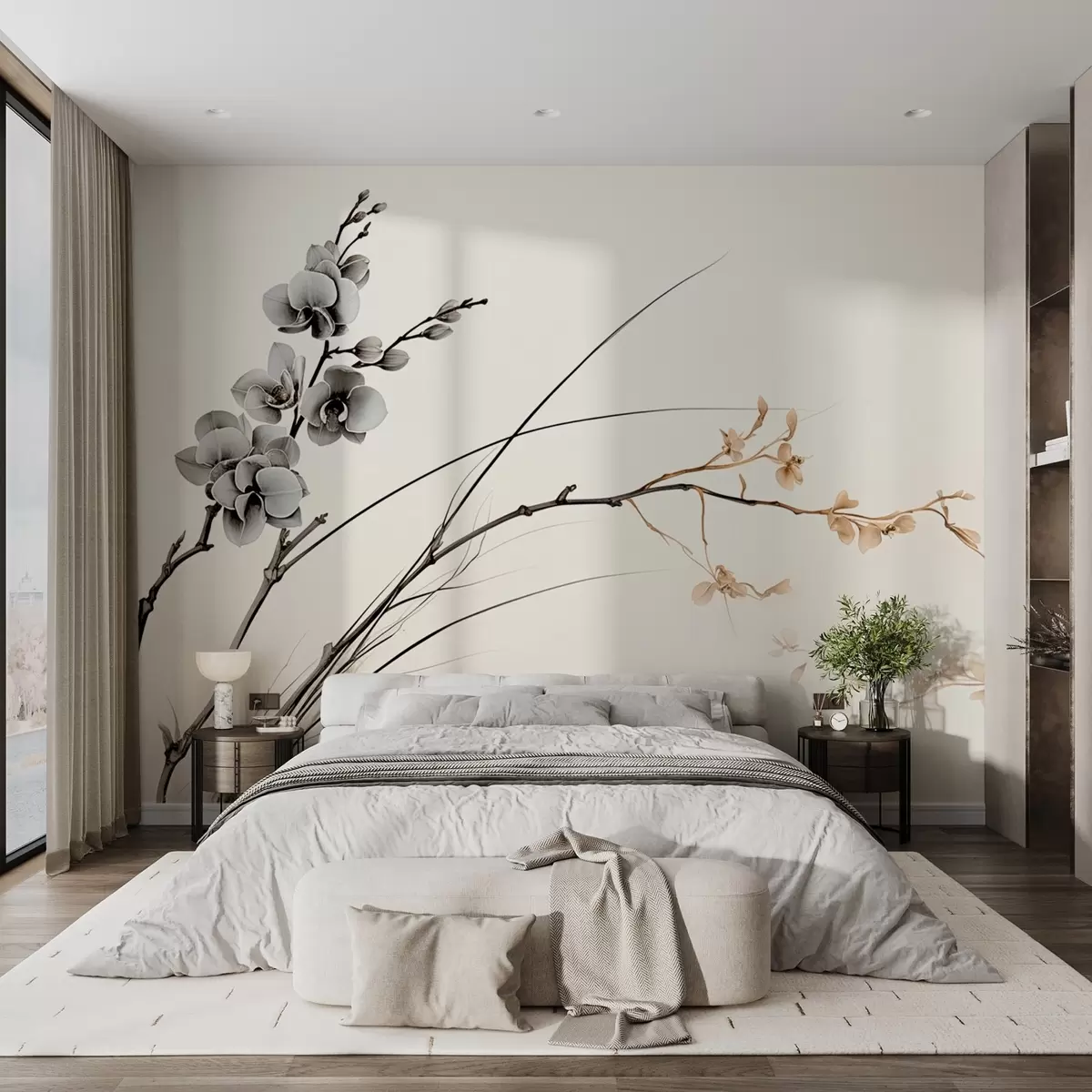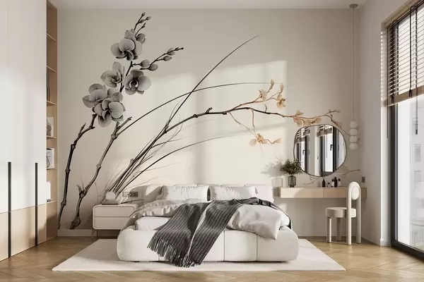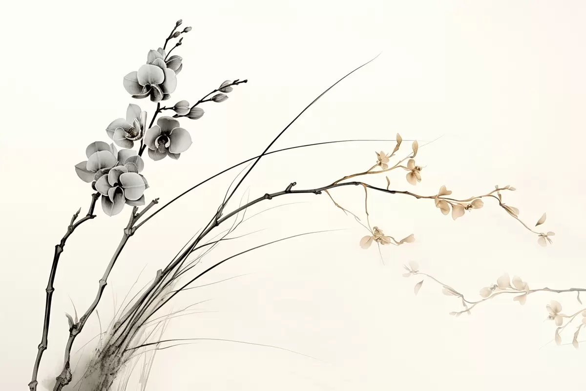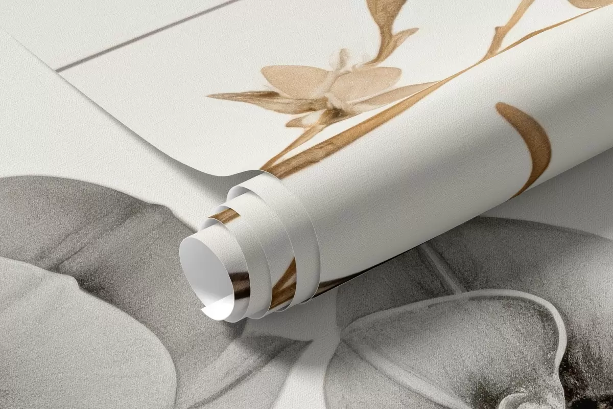 Fototapeten Minimalistischer Orchideenzweig in weichen Sepia- und Grautönen N° w09250