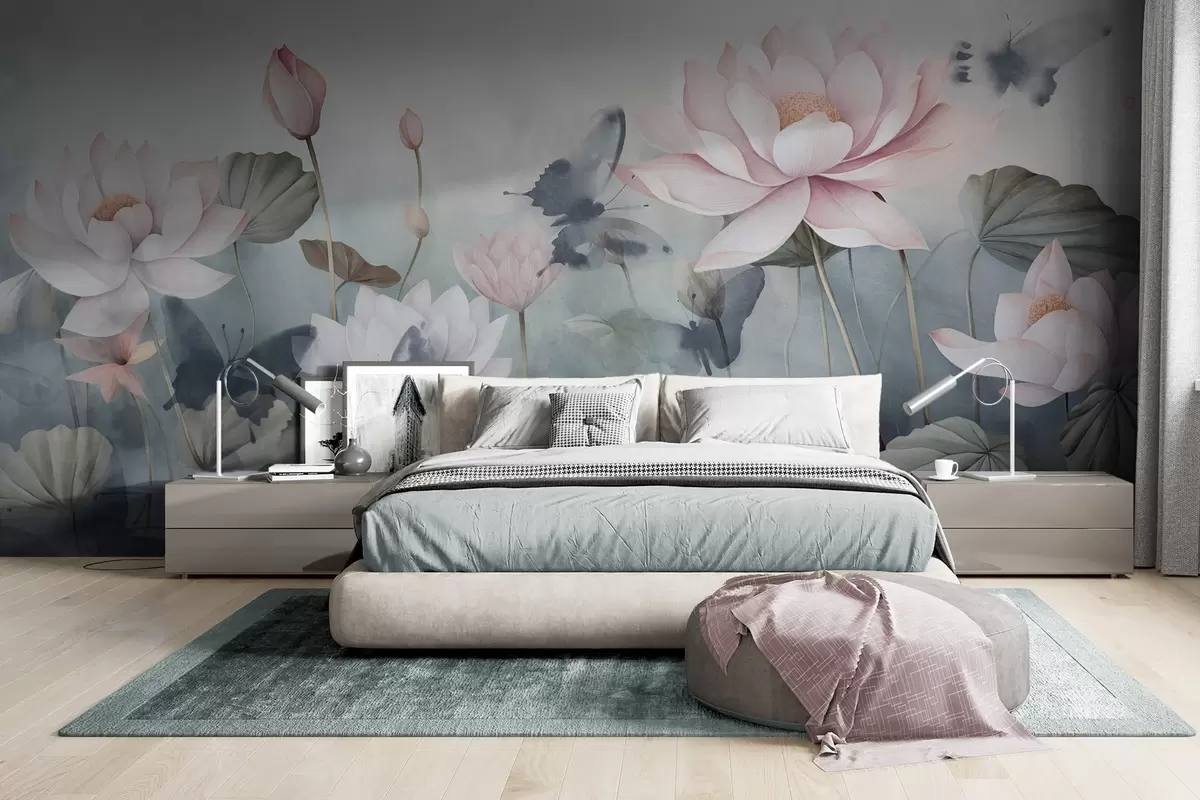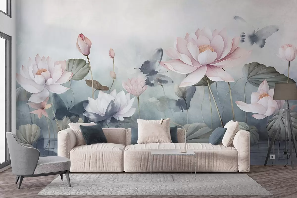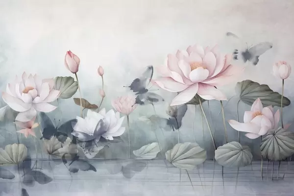 Fototapeten Lotus strukturierte Blumen mit rosa Pastell Blütenblätter, grüne Blätter, Wasser Reflexion, weiche Pastellfarben, Aquarell-Effekt N° w09254