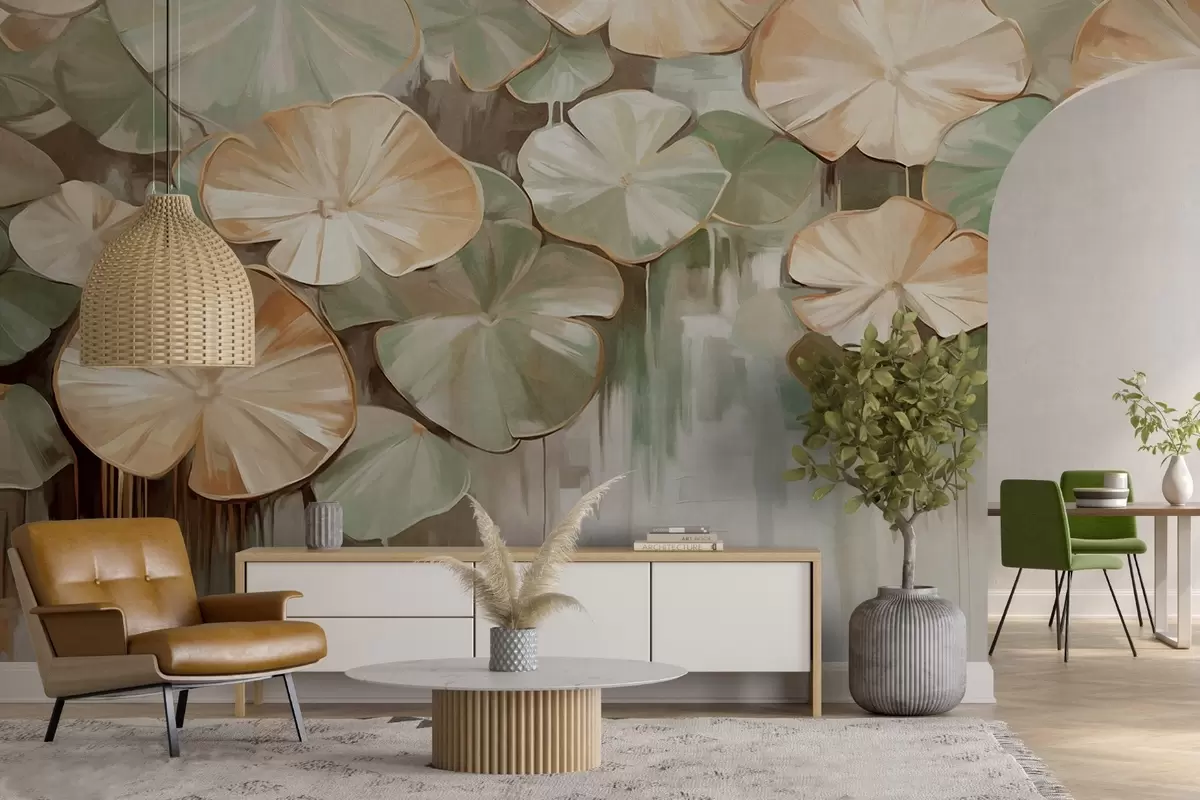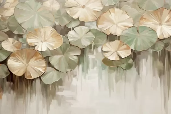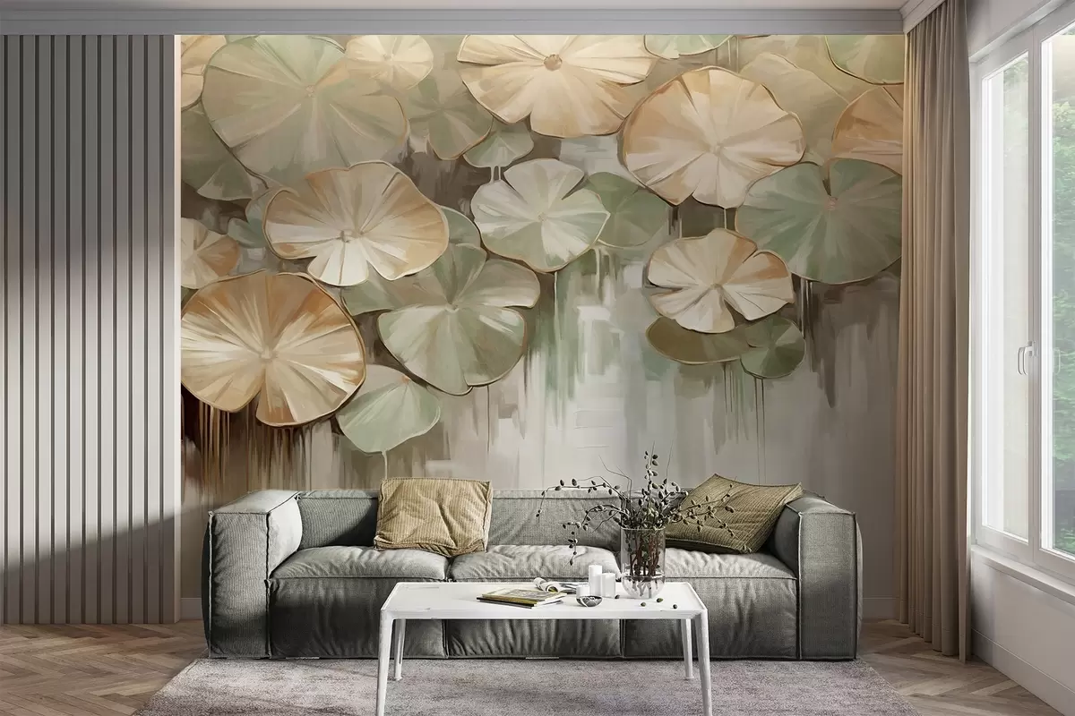 Fototapeten Strukturierte Seerosenblätter mit grünen und beigen Farben in einem Teich, der Hintergrund ist eine unscharfe Mischung aus Weiß, Grün und Braun N° w09255
