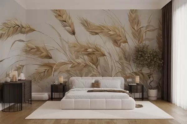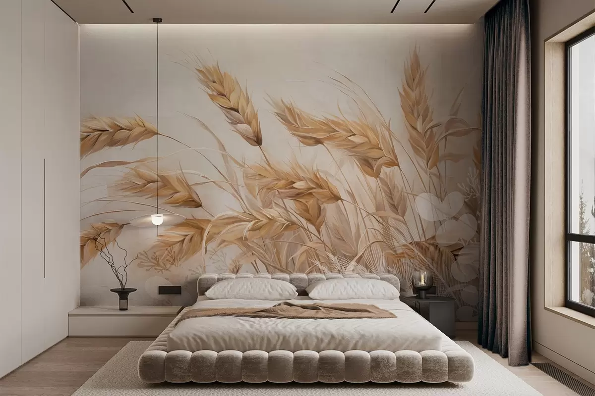 Fototapeten Weizenfeld mit beigen Ähren, die sich im Wind wiegen, weiche und gedämpfte Farben, die ein Gefühl von Wärme vermitteln N° w09264