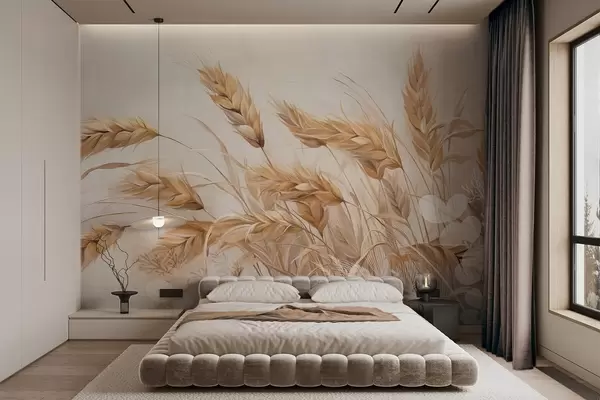 Fototapete Weizenfeld mit beigen Ähren, die sich im Wind wiegen, weiche und gedämpfte Farben, die ein Gefühl von Wärme vermitteln w09264