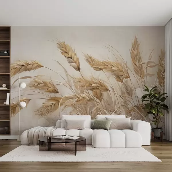 Fototapeten Weizenfeld mit beigen Ähren, die sich im Wind wiegen, weiche und gedämpfte Farben, die ein Gefühl von Wärme vermitteln N° w09264