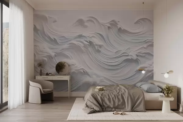Fototapeten Weiß und hellblau strukturierte abstrakte Meereswellen mit Schaum, die von links nach rechts fließen, dynamischer und strukturierter Druck N° w09266