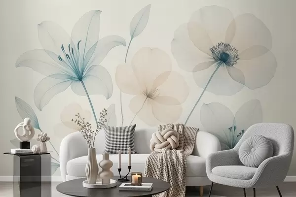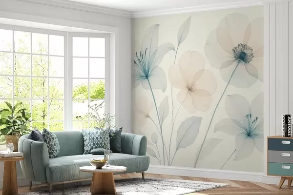 Fototapeten Zarte Blumen in pastellblauem und cremefarbenem Aquarellstil N° w09287