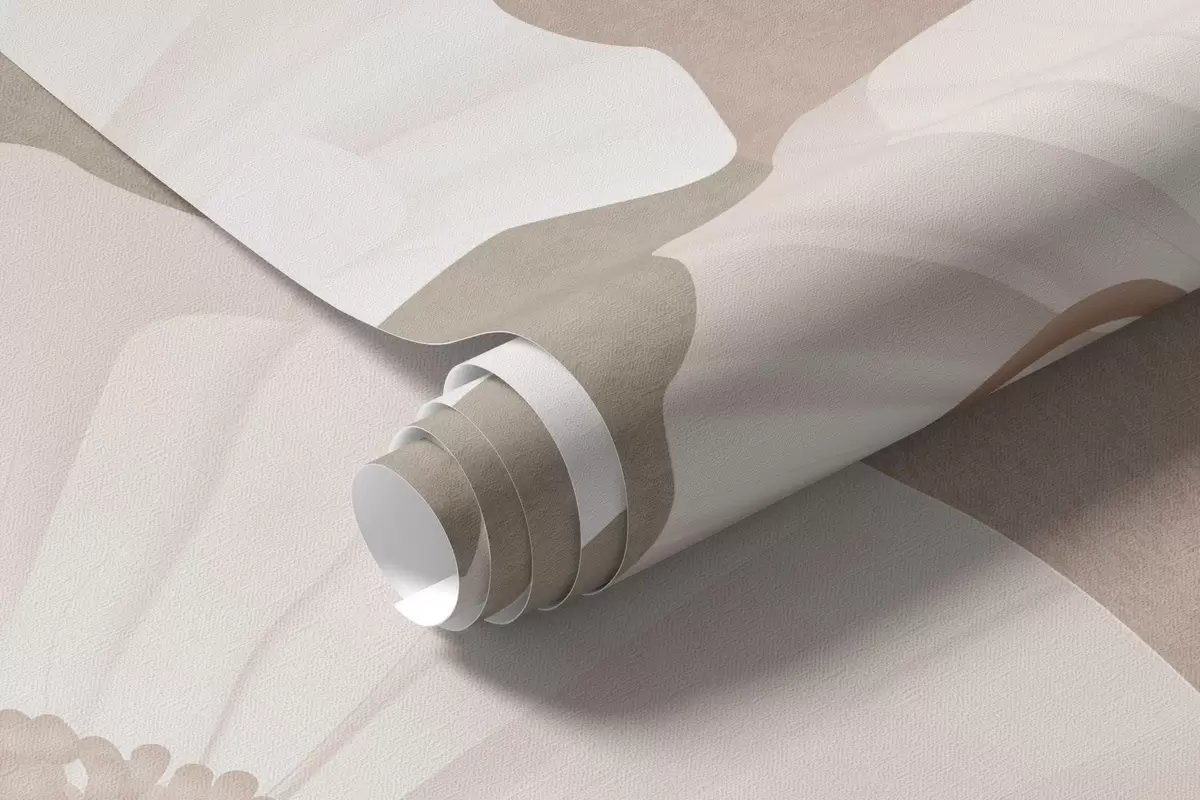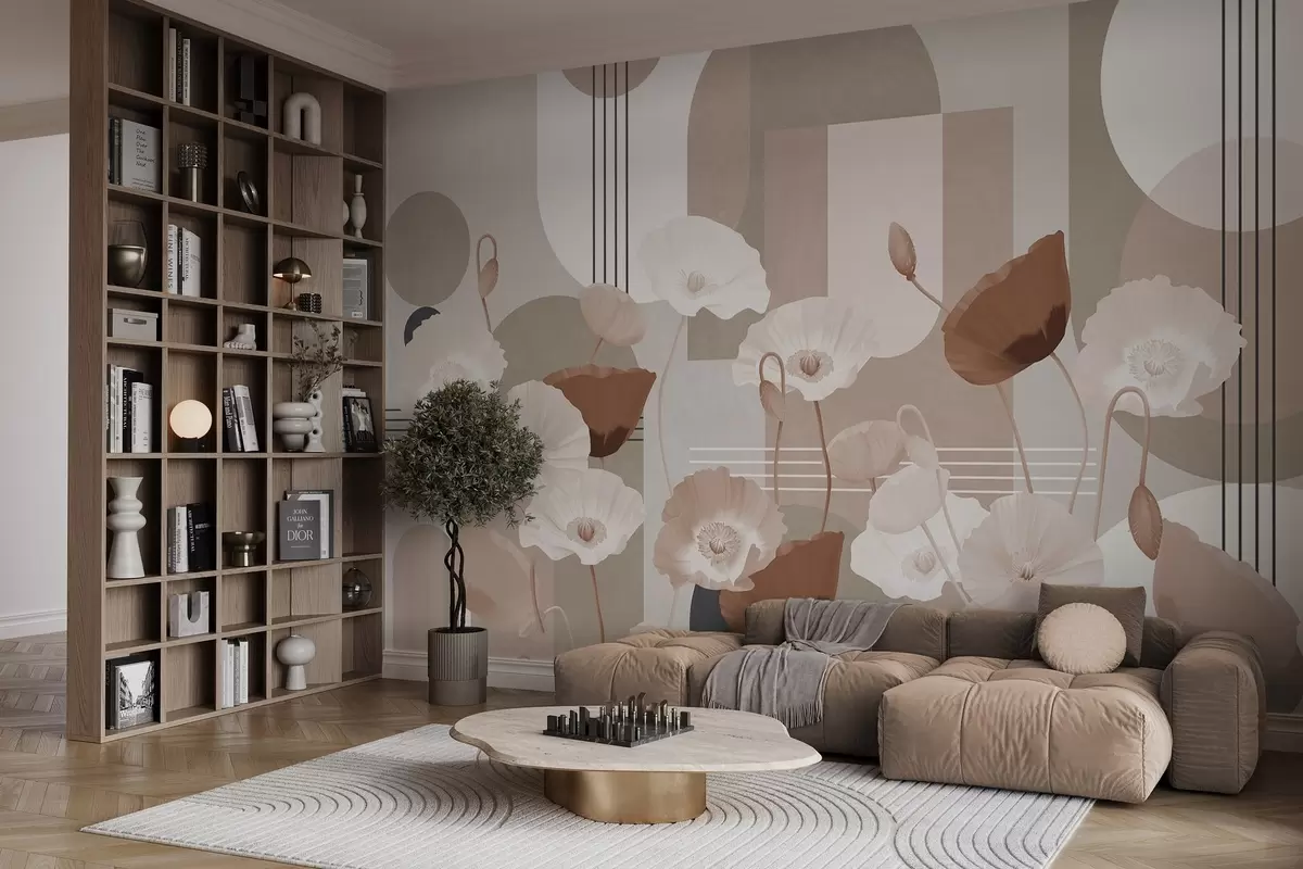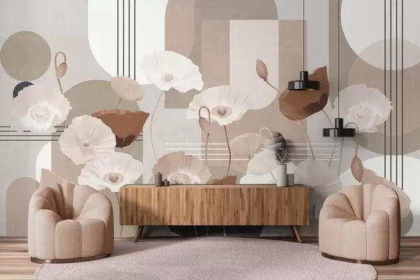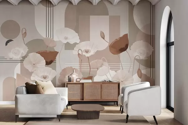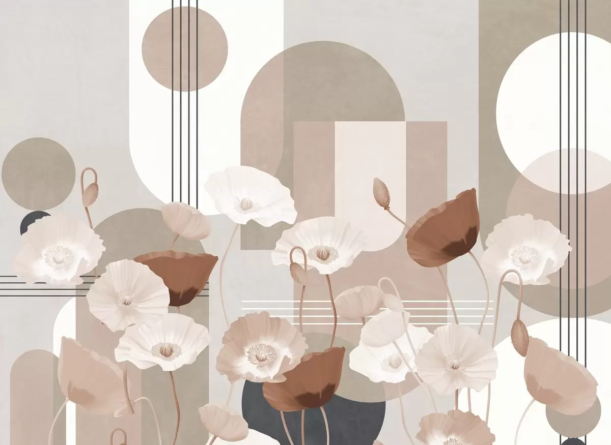 Fototapeten Mohnblumen in weißen und beigen Farben mit geometrischen Formen im Hintergrund, Kreise und Bögen, minimalistischer Stil, weiche Farben N° w09289