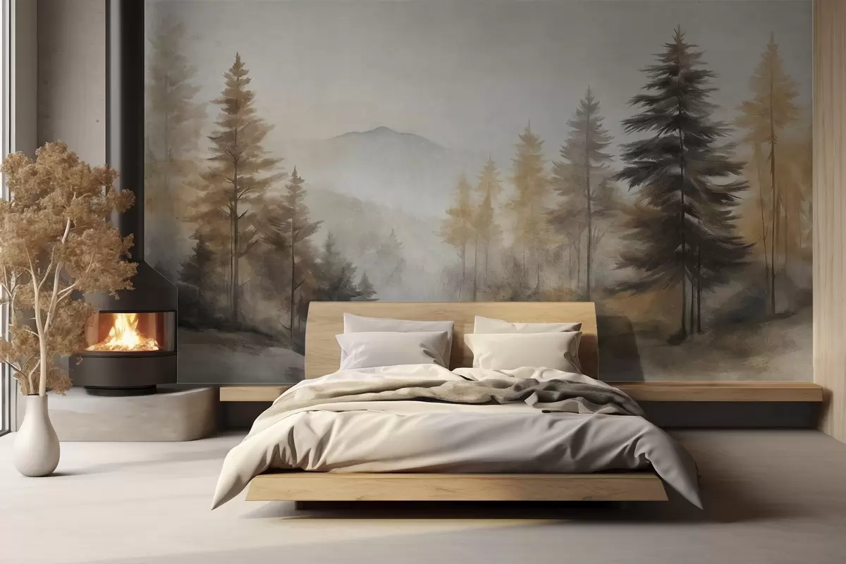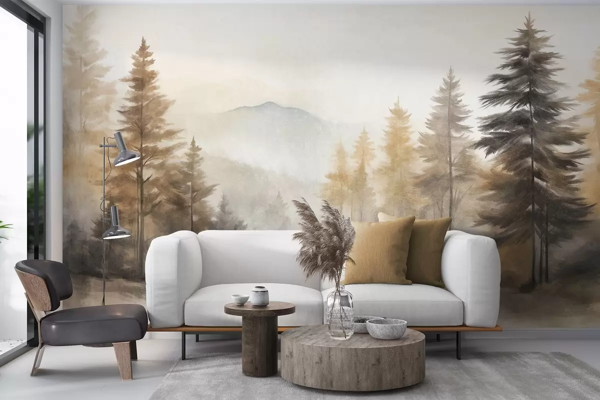 Fototapeten Texturierter Herbstwald mit hohen Kiefern und Bergen im Hintergrund, die Farben sind gedämpft und erdig Malerei Stil N° w09290