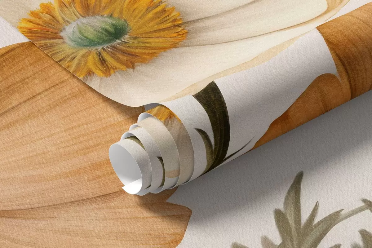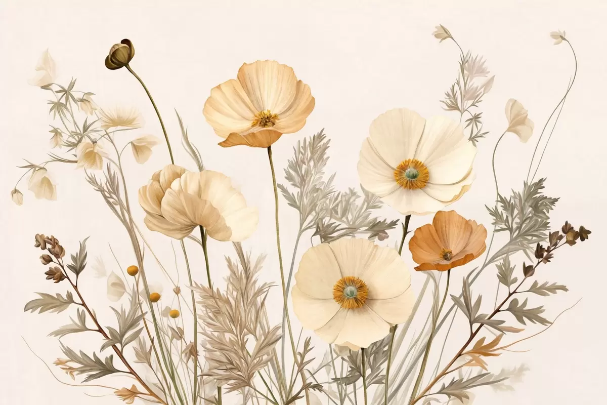 Fototapeten Orange und weiße Vintage strukturierte Mohnblumen mit dünnen Stielen und Blättern, hellbeige Hintergrund, Aquarell-Stil N° w09293