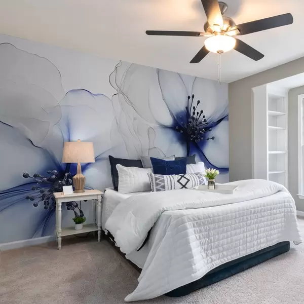 Fototapeten Zwei durchscheinende, strukturierte blaue Blüten mit sichtbaren Staubgefäßen, sich überlappenden zarten Blütenblättern und einer weich fließenden Textur N° w09295v1