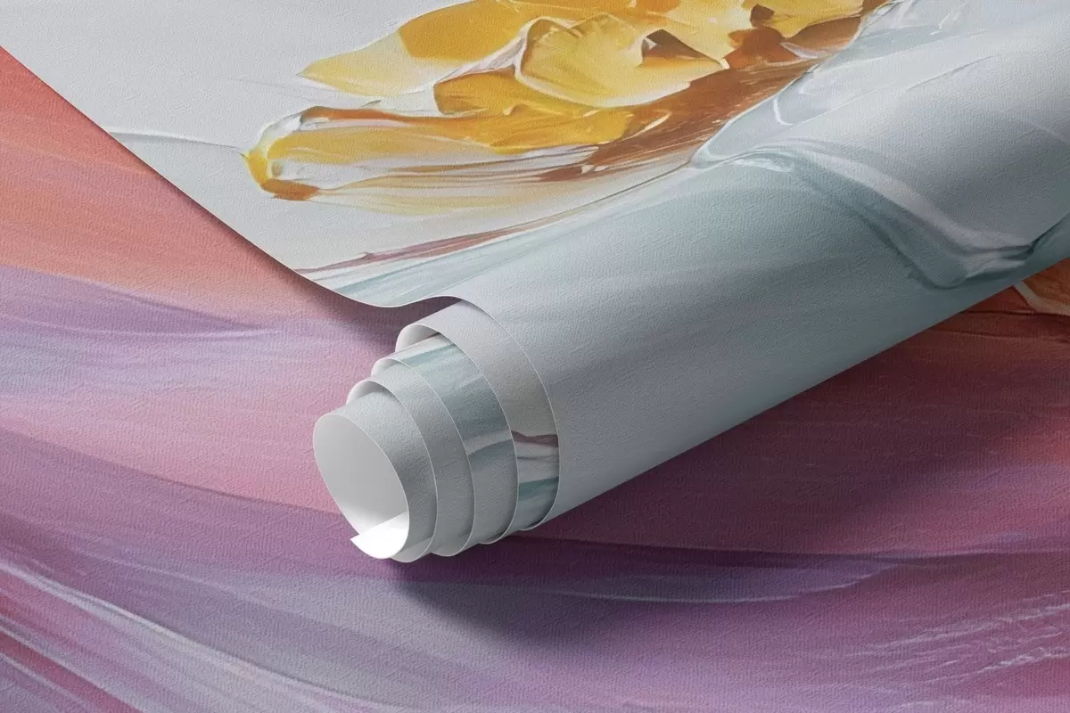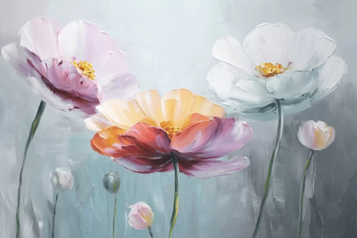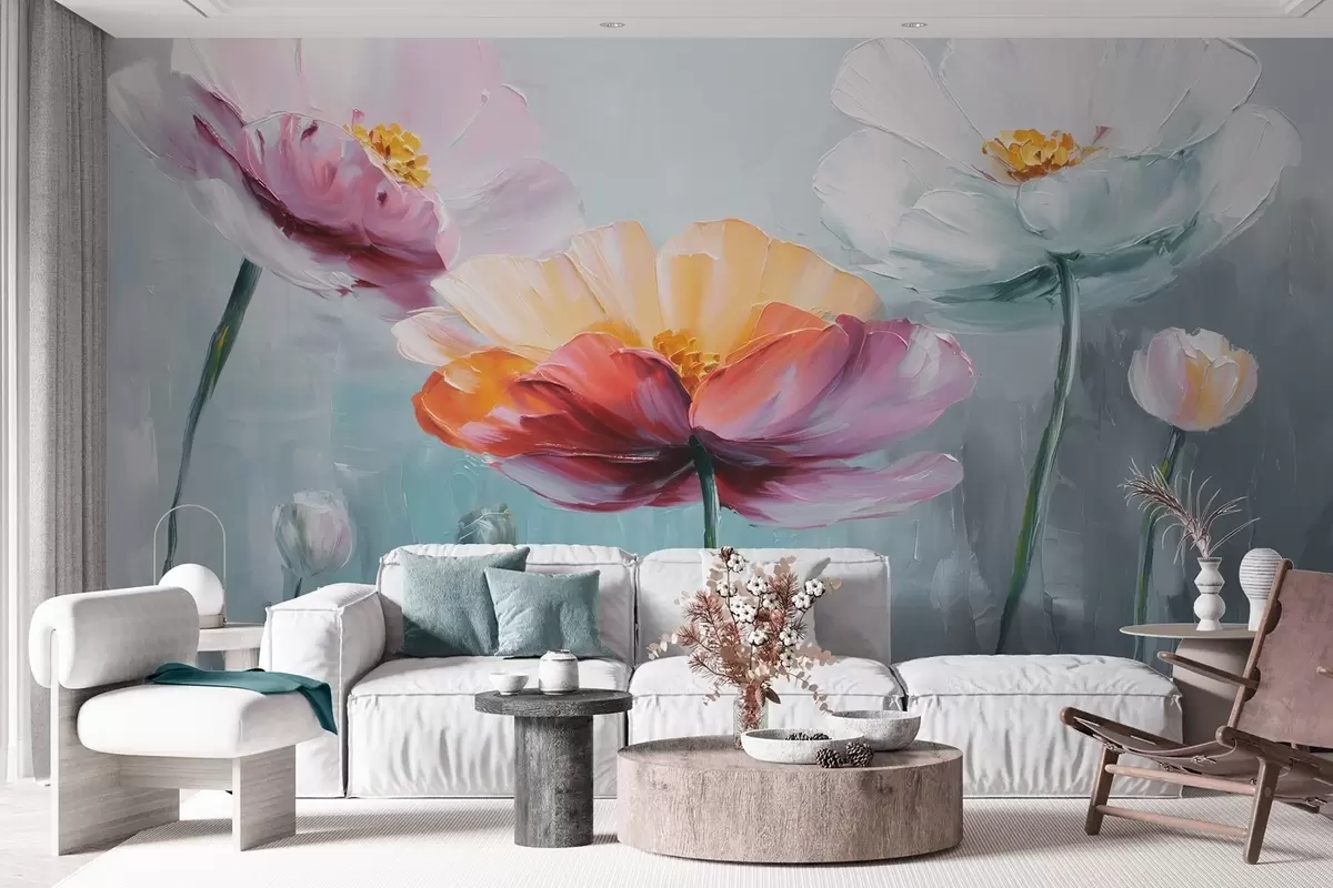 Fototapeten Helle Blumen in Ölmaltechnik auf blauem Hintergrund N° w09310