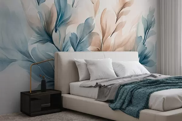 Fototapeten Blaue und braune abstrakte Blätter mit sichtbaren Pinselstrichen, leicht und texturiert, weiche Farbpalette, Aquarelleffekt N° w09313