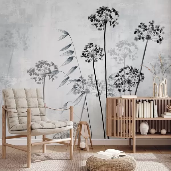 Fototapeten Getrocknete Blumen Zeichnung mit langen Stielen, monochrome Palette, vor einem strukturierten, hellgrauen Hintergrund, botanische Illustration N° w09314