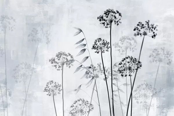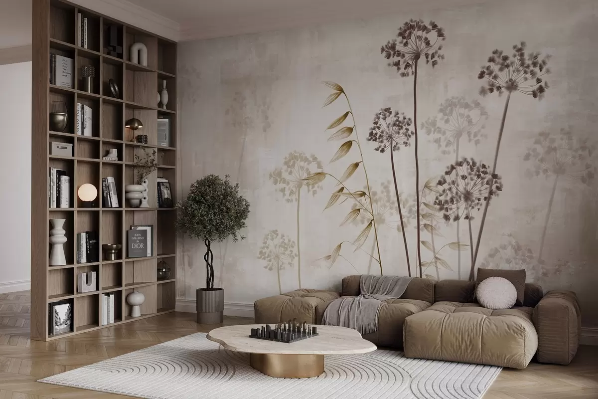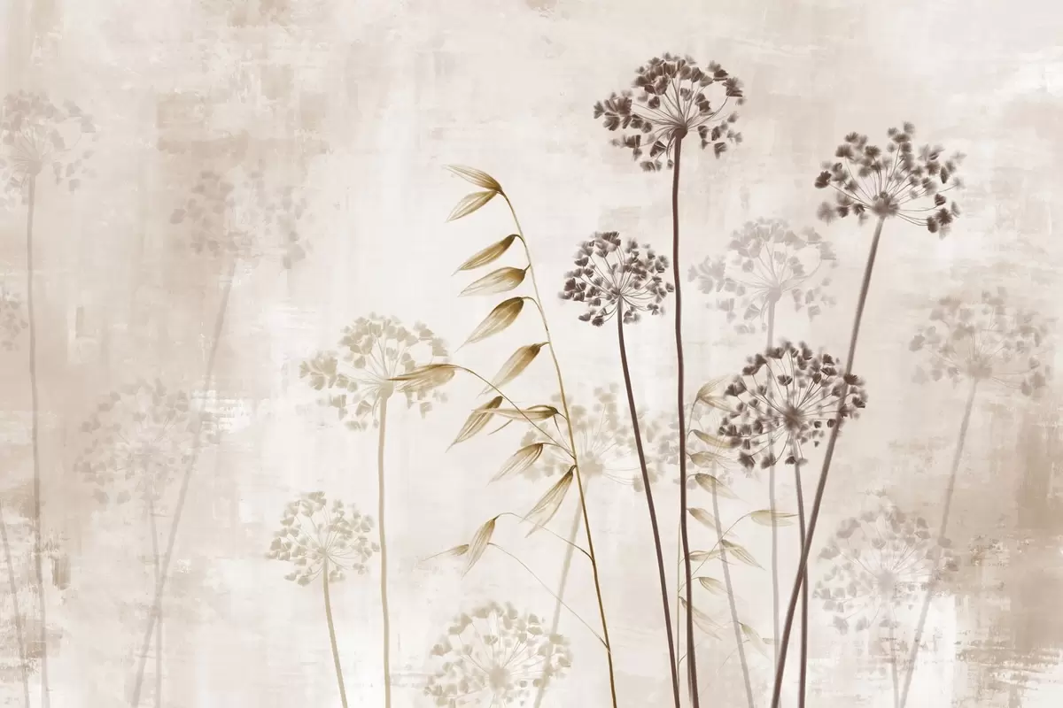 Fototapeten Zeichnung von getrockneten Blumen mit langen Stielen, monochrome Palette, vor einem strukturierten, hellbeigen Hintergrund, botanische Illustration N° w09314v1