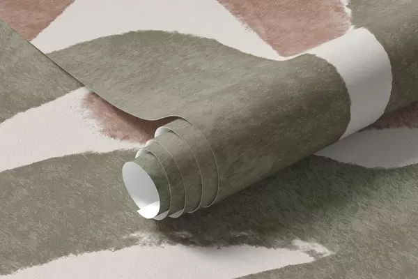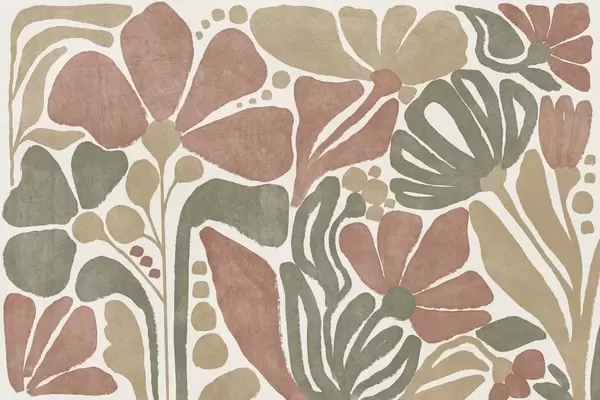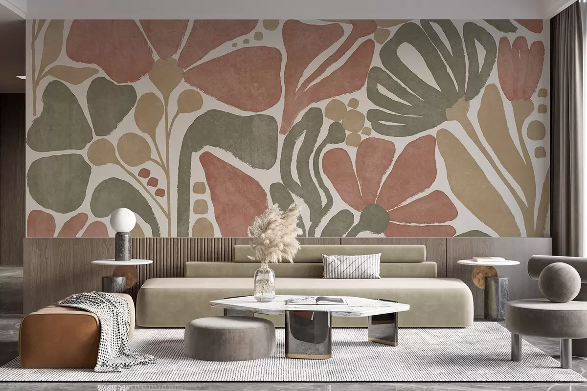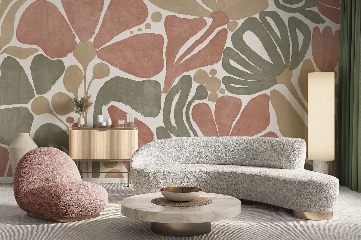 Fototapeten Abstrakte Blumen in Rot-, Grün- und Beigetönen, mit hellem Hintergrund, in einem flachen, stilisierten modernen minimalistischen Design N° w09315