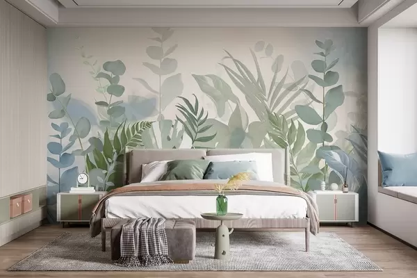Fototapeten Pastellgrüne Pflanzen Farne, monstera und Eukalyptus, Licht strukturierten Hintergrund, weiche Beleuchtung, friedlich, botanische Illustration N° w09316
