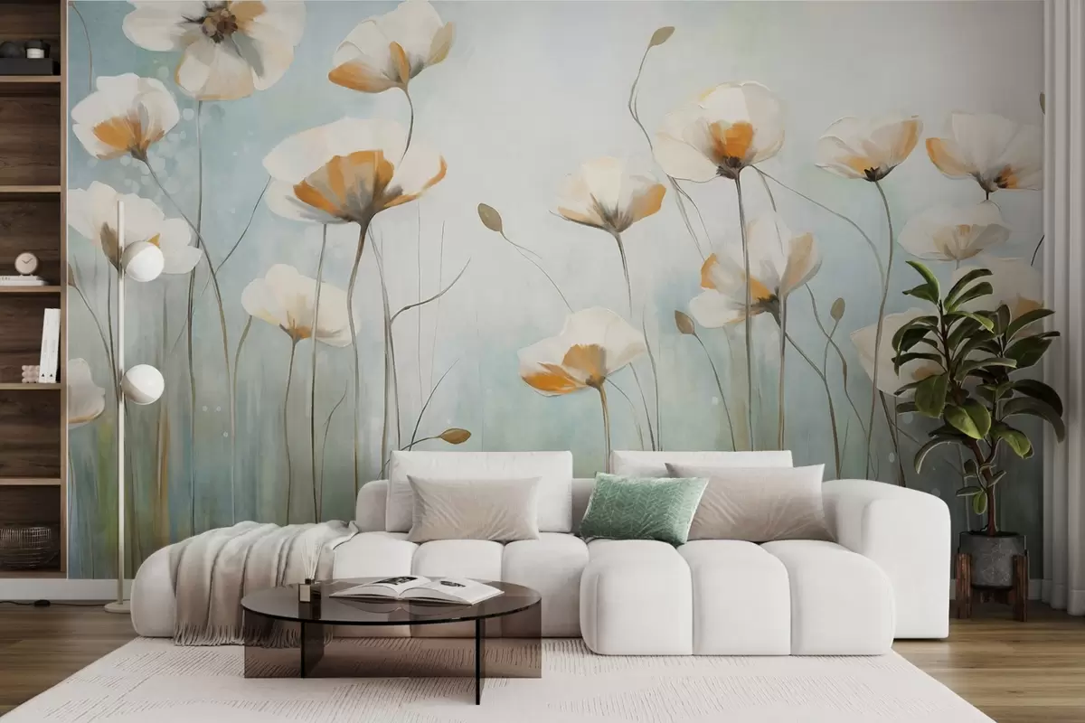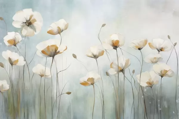 Fototapeten Weiße strukturierte Mohnblumen auf langen Stielen, hellblauer und grüner Hintergrund, weiche Pinselstriche, zartes Blumenfeldarrangement N° w09317