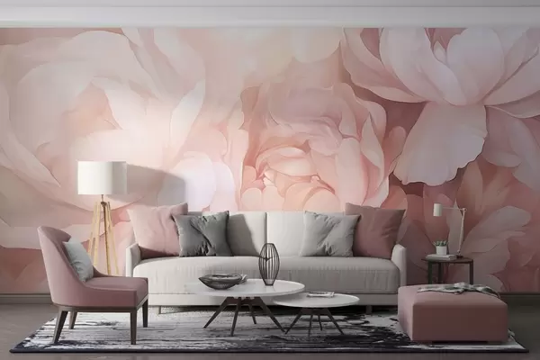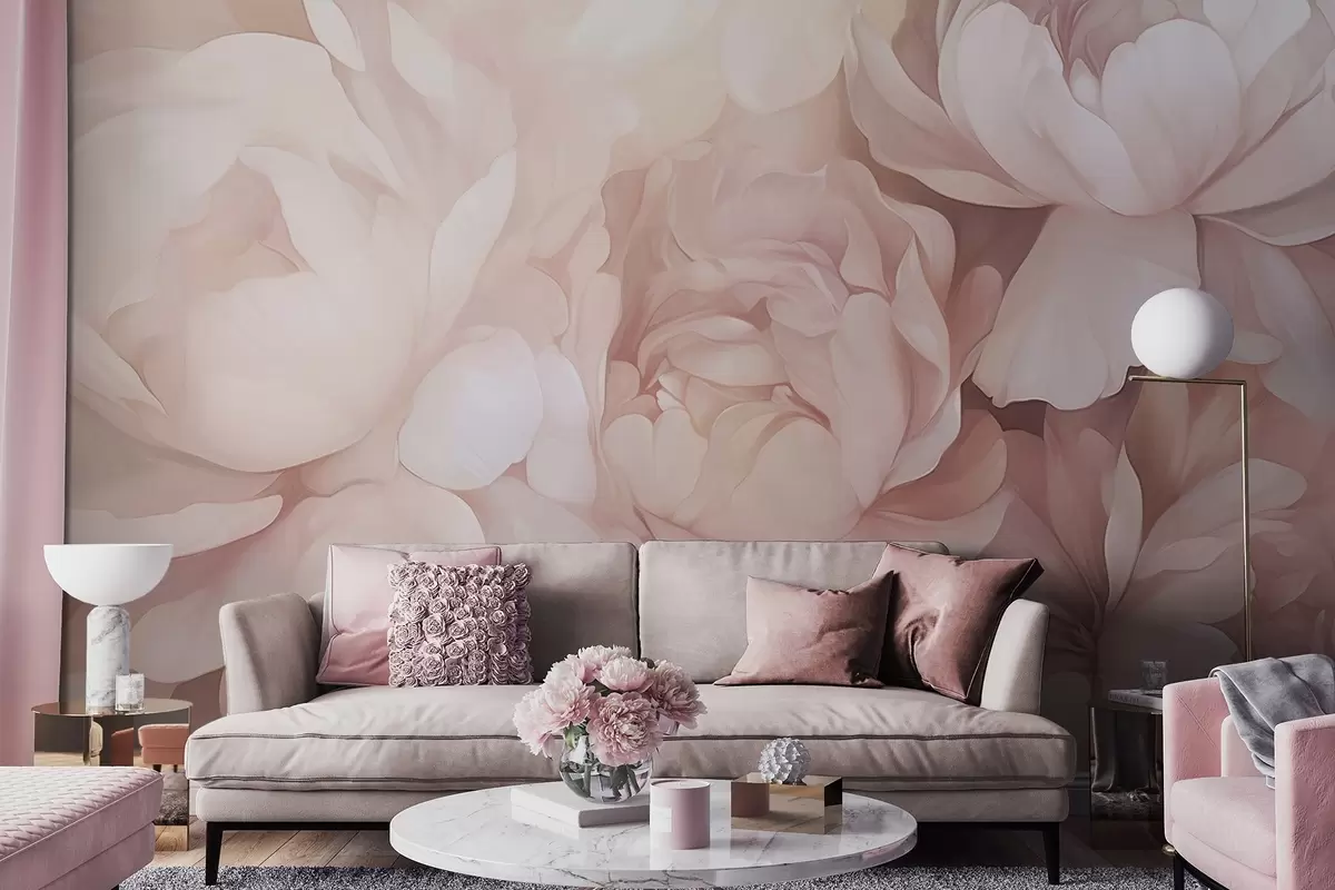 Fototapeten Helle, pastellrosa Pfingstrosen mit weichen, strukturierten, zarten Blütenblättern, die dicht aneinandergereiht eine dichte Blumenkunst ergeben, sanfte Beleuchtung N° w09319